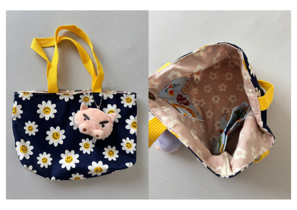 裏布は家にある布でと探したところ、無地の布がなく、中まで柄だらけのカバンになったのですが、